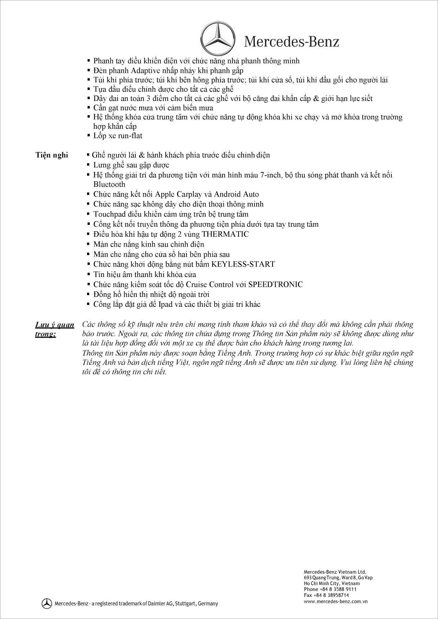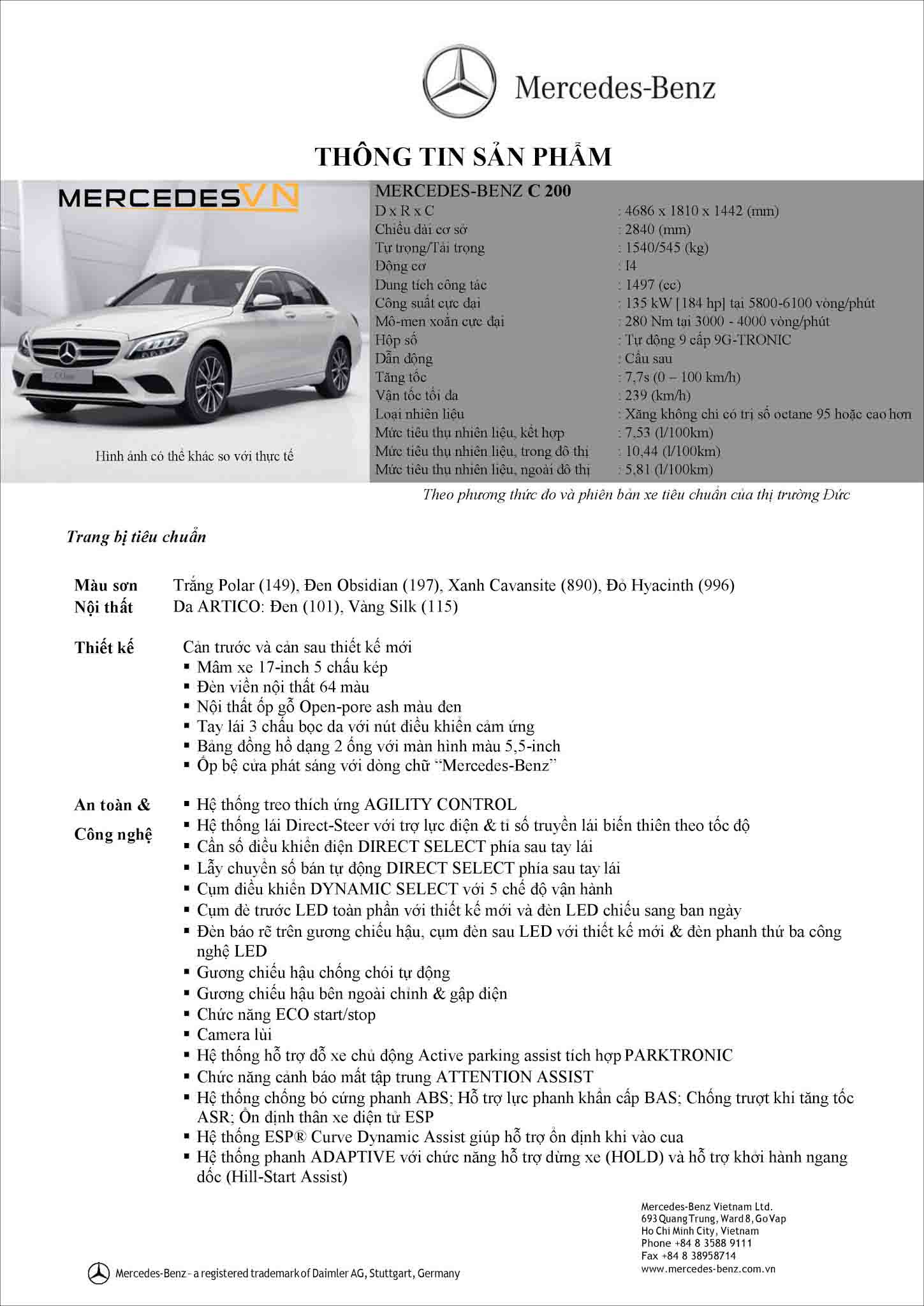 21/02/2019 3436Cập nhật Bảng thông số kỹ thuật Mercedes C200 2019 facelift vừa được Mercedes-Benz Việt Nam trình làng ngày 21/2/2019. Nó đang được bán ra thị trường giá 1.499 tỷ VNĐ. Đây là chiếc xe sedan 5 chỗ thiết kế thể thao với nhiều tiện ích và công nghệ hiện đại.