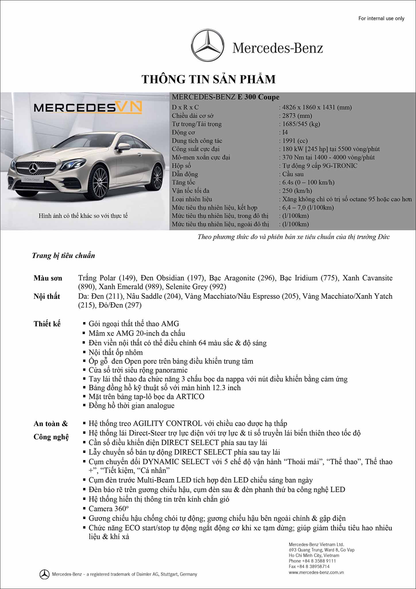 Dưới đây là Bảng thông số kỹ thuật Mercedes E300 Coupe 2019 mới nhất vừa được chúng tôi cập nhật từ Mercedes Việt Nam. Quý khách hàng cần thêm thông tin có thể liên hệ với chúng tôi qua số Hotline để được nhân viên tư vấn ngay.