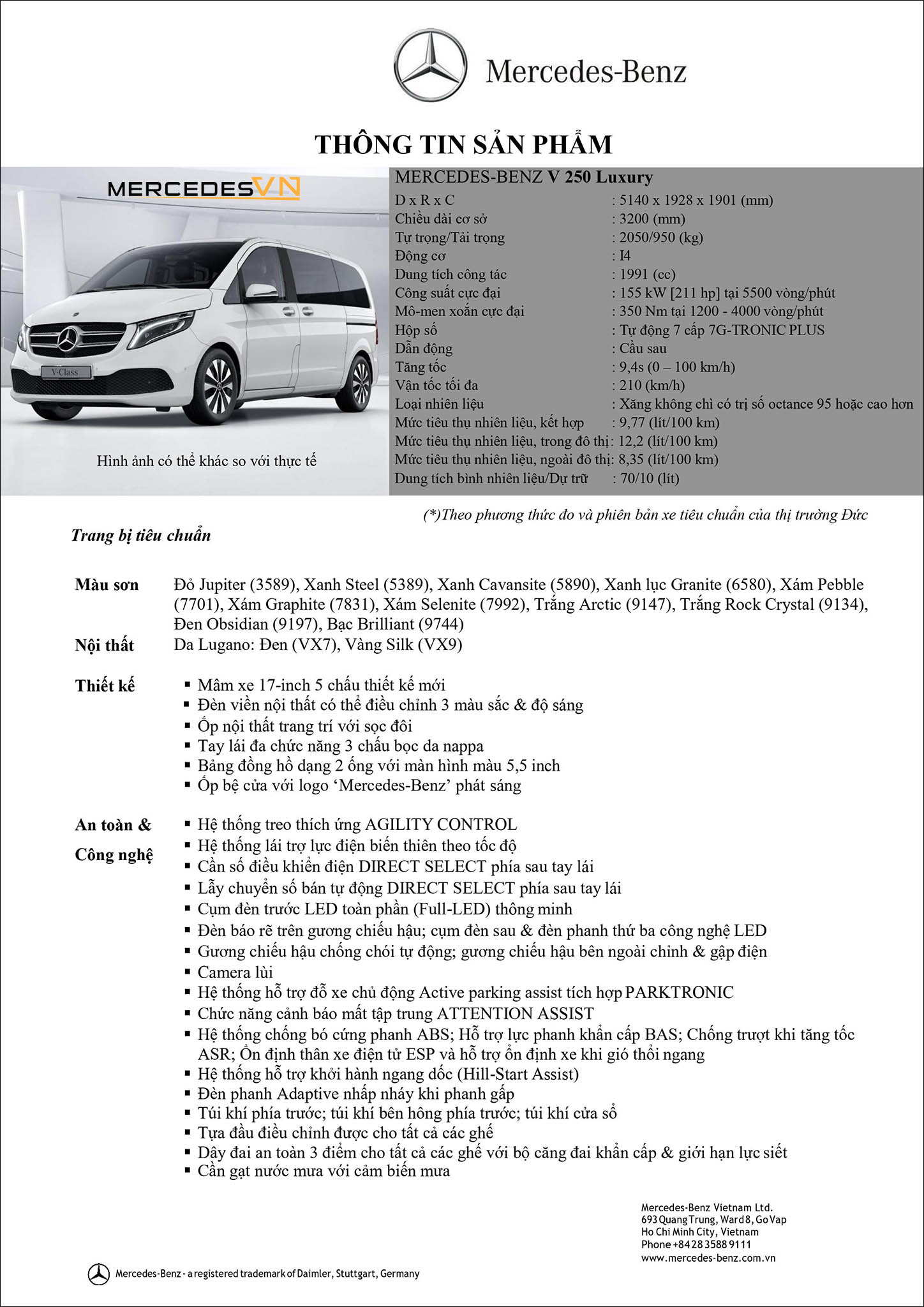 Dưới đây là Bảng thông số kỹ thuật Mercedes V250 AMG 2020 mới nhất vừa được chúng tôi cập nhật từ Mercedes Việt Nam.