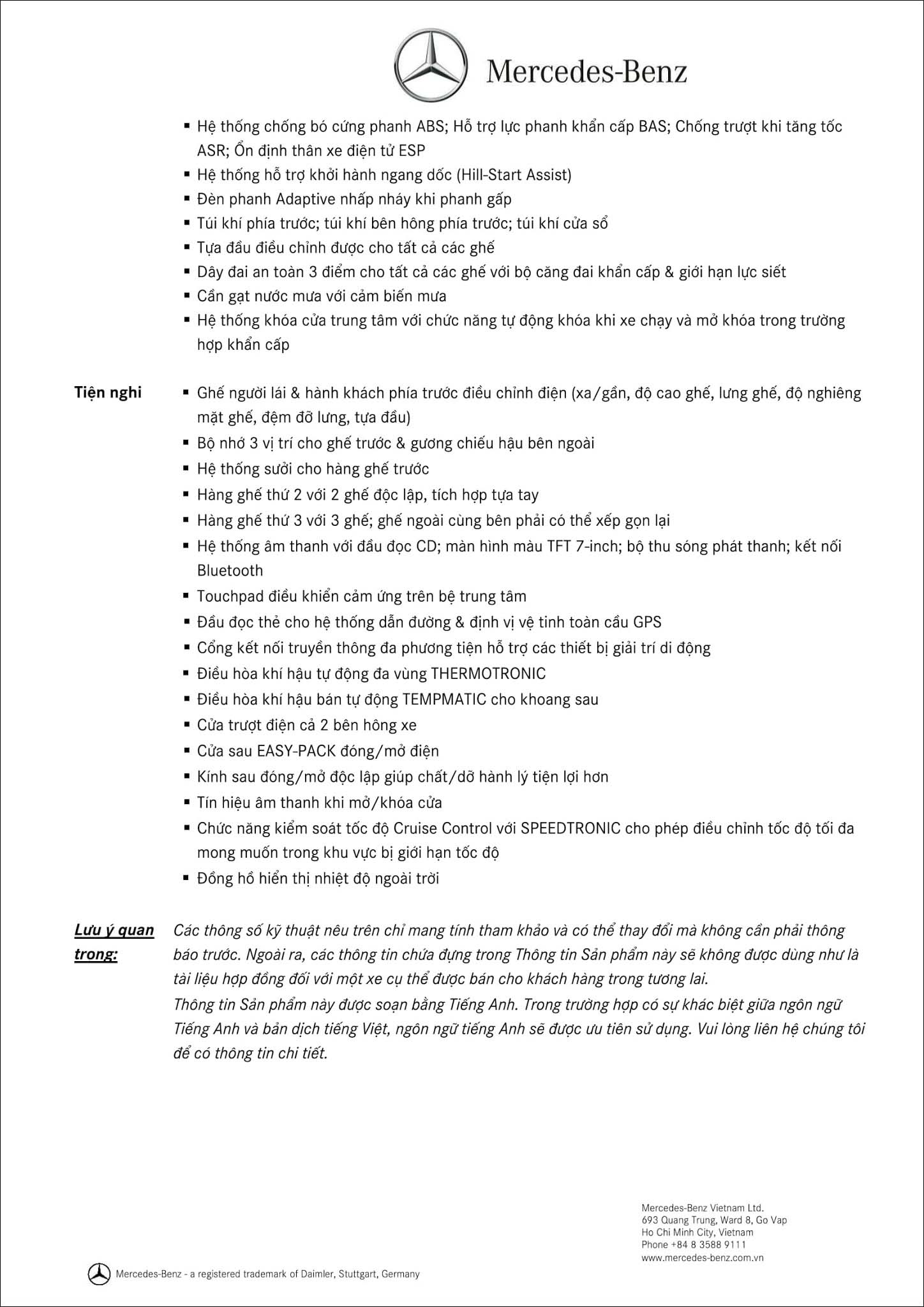- Bảng thông số kỹ thuật Mercedes V250 Avantgarde 2019